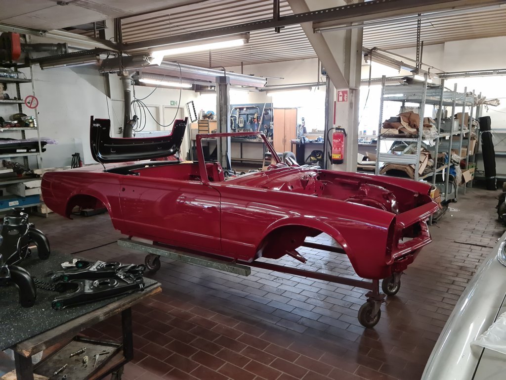 Dieser MB 280 SL in dunkelrot mit schwarzer Innenausstattung und schwarzem Stoffverdeck, kam vor einigen Jahren in stark verschlissenem Zustand zu uns, so dass der Wagen auf Wunsch des Kunden umfangreich neu aufgebaut wurde. Die Karosserie wurde nach der vollständigen Zerlegung entlackt und anschließend mit perfekten Spaltmaßen instand gesetzt. Dananch wurde der Wagen in einem sehr schönen Dunkelrotton (Original MB-Farbe) neu lackiert und gefinisht. Die Technik und alle Verschleissteile wurden entweder umfangreich überholt oder erneuert. Die Pagode präsentiert sich in Neuwagenzustand und fährt wunderbar. Die Bilder zeigen den großen Aufwand des Neuaufbaus.